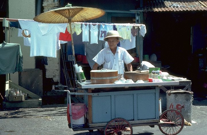 | In addition to Indian Rojak, tau huay (soya beancurd) was another type of food that could be found among the street hawkers in the area between the 1950s and 1970s. One of the most popular stalls at the time was located at the intersection of Beach Road and Rochor Road. Operated by Xu Jun Jie and his wife Madam Tan Jin Jiao through a pushcart similar to the one above, their tau huay was known for its super-smooth texture. It still can be found today in the Rochor Original Beancurd shop in Short Street. (Image Credit: Ronni Pinsler Collection, courtesy of National Archives of Singapore) |